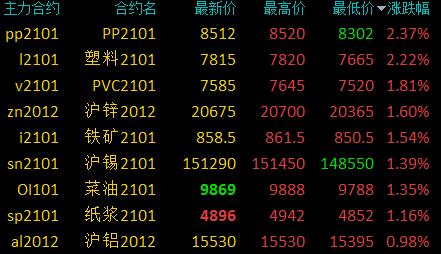 国内商品期货收盘,大涨近8%,VC、沥青等涨超3%,沪银涨超2%,郑煤、焦炭等涨超1%,TA、G等小幅上涨;锰硅、焦煤等跌超2%,白糖、菜粕等跌超1%,豆二、豆粕等小幅下跌。