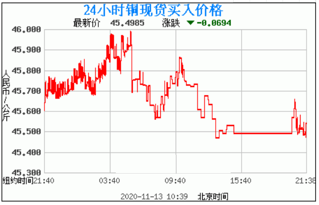铜价格走势图今日最新铜价行情(2020年11月13日) 今日最新铜价:45.4985涨跌:-0.0694 备注:以上铜价格仅供参考,请以官方价格为准。