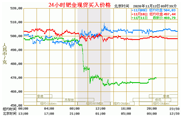 钯金价格走势图今日最新钯金行情(2020年11月12日) 今日最新钯金行情:469.79 备注:以上钯金价格仅供参考,请以官方价格为准。