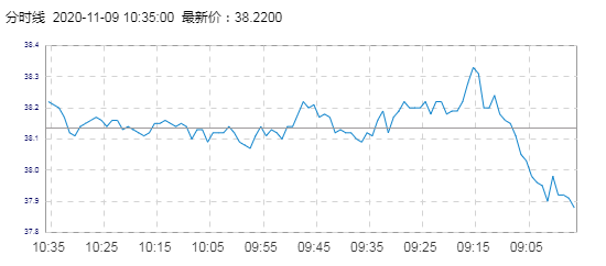 WTI原油价格实时(2020年11月9日) 名称 最新价 涨跌 涨跌幅% 开盘价 昨收价 最高价 最低价 WTI 38.18