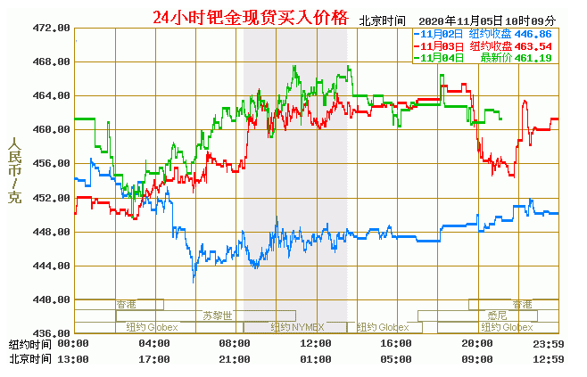 钯金价格走势图今日最新钯金行情(2020年11月5日) 今日最新钯金行情:461.19 备注:以上钯金价格仅供参考,请以官方价格为准。