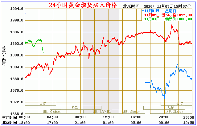 周三(11月3日)对全球来说是一个极为关键的日子,今日总统大选来到决战之日,未来四年谁主白宫将揭晓。在此之前,亚市盘中现货黄金短线冲高回落,现交投于1890附近,白银转跌逼近24美元关口。 今日黄金价格走势图(2020年11月3日)