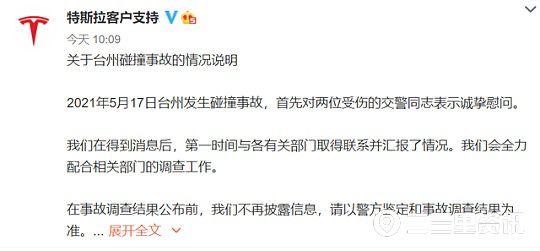 5月17日下午,浙江台州一高架桥上,一辆特斯拉碰撞正在现场处置交通事故的交警。据台州市公安局交通警察局5月17日晚通报,事故造成两名交警受伤,其中一人伤势较重。 5月18日,特斯拉官微回应称会全力配合相关部门的调查工作。 5月18日下午,“台州交警”微博通报称,事故中交通警务人员陈锡永,经全力抢救无效不