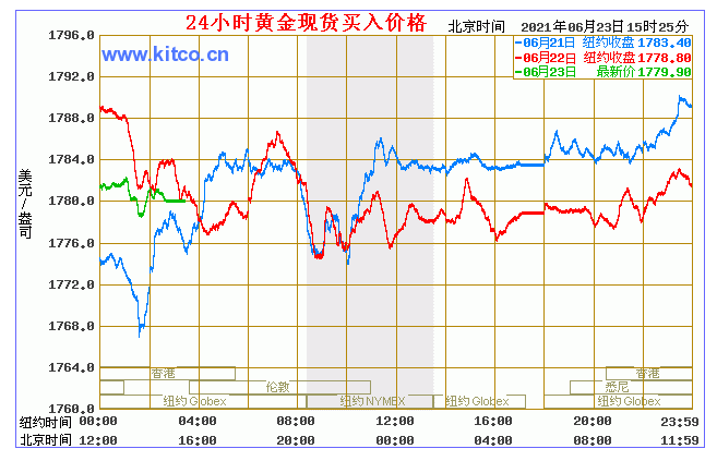 周三(6月23日),国际金价持坚,因此前美联储主席鲍威尔承诺不会仅仅基于对短期通胀上升的恐惧而过快加息,但美元走强限制了金价上行空间。 今日黄金价格走势图(2021年6月23日)