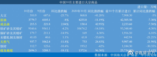 #煤炭##嘉盛集团##石油##大宗商品#中国10月能源进口继续大增:煤炭增近100%、成品油42%、天然气24%。2021年10月我国进口总值同比增长21.8%,大豆、铁砂矿、原油、铜材以及钢材等商品进口量同比下滑,国际大宗商品价格上涨仍是推高进口值的重要原因。