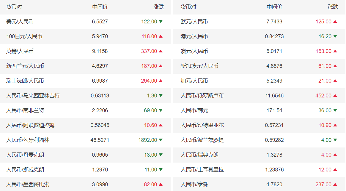 中国外汇交易中心4月6日受权公布人民币对美元、欧元、日元、港元、英镑、澳元、新西兰元、新加坡元、瑞士法郎、加元、林吉特、卢布、兰特、韩元、迪拉姆、里亚尔、福林、兹罗提、丹麦克朗、瑞典克朗、挪威克朗、里拉、墨西哥比索及泰铢的市场汇价。 4月6日人民币汇率中间价如下: 100美元655.27人民币 100欧元7