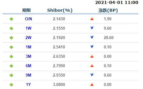 4月1日上海银行间同业拆放利率hior: 隔夜hior报2.1430%,上涨1.90个基点;1周hior报2.1550%,下跌9.60个基点; 2周hior报2.1920%,下跌28.60个基点;1个月hior报2.5410%,下跌0.10个基点。