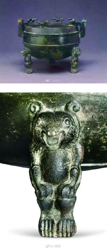 你知道2000年前的高压锅长啥样吗? 河北保定满城汉墓出土的一口熊足铜鼎,因构思巧妙被称为“古代的高压锅”。熊足铜鼎器身呈椭圆球形,鼎的三足为蹲立状的小熊,咧口微笑,模样十分娇憨可爱。鼎盖上还环立着四个小兽。 据悉,满城汉墓是西汉中山靖王刘胜及其妻窦绾之墓,有“天下第一崖墓”之称。河北博物院社教