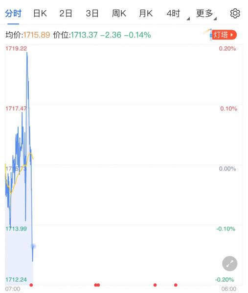 (本分析观点由图表家自动化系统撰写,有效期为8-12小时) 图为黄金15分钟走势图,价格短线走低,且正交投于前高1720.6下方,若价格持续下行,短线或测试斐波那契23.6%回调位1710.26支撑,跌破后盘中需关注2/1甘氏线,后市或将进一步看跌至斐波那契38.2%回调位1703.86。 若价格上行,短线或测试1720.6阻力,突破后