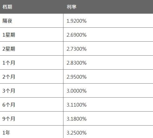 3月9日香港银行同业人民币拆息HIOR(早间更新): 隔夜HIOR报1.9200%,一周期HIOR报2.6900%,两周期HIOR报2.7300%; 1个月HIOR报2.8300%,2个月HIOR报2.9500%,3个月HIOR报3.0000%。 注:上述资料仅供参考,人民币拆息将根据本行不时公布的息率为准。