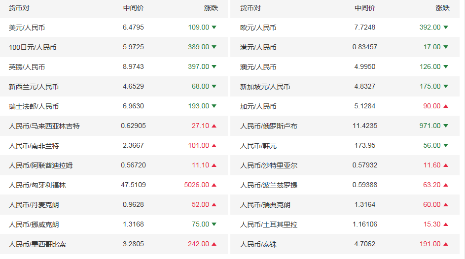 今日(3月8日)人民币对美元汇率中间价为6.4795元,上调109个基点。 中国人民银行授权中国外汇交易中心公布,2021年3月8日银行间外汇市场人民币汇率中间价为:1美元对人民币6.4795元,1欧元对人民币7.7248元,100日元对人民币5.9725元,1港元对人民币0.83457元,1英镑对人民币8.9743元,1澳大利亚元对人民币4.9950元