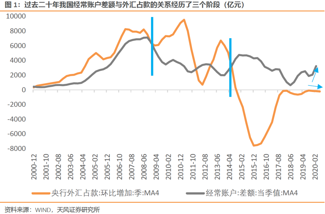 外汇占款变动对于流动性和货币政策是次要逻辑,主要逻辑仍然是央行所锚定的货币政策目标,其既定取向不会轻易被跨境资本流动影响。 文:天风宏观宋雪涛/联系人赵宏鹤 过去二十年,我国经常账户差额与外汇占款的关系经历了三个阶段:2000-20
