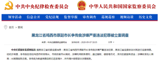 中央纪委国家监委网站讯据黑龙江省纪委监委消息:黑龙江省鸡西市原副市长李传良涉嫌严重违法犯罪,黑龙江省监委依法对其进行监察调查。经初步调查,李传良在担任鸡西市财政局长、市政府副市长期间,涉嫌利用职务便利,通过骗娶侵吞等方式,贪污巨额国有资金;涉嫌收受他人贿赂;长期搞钱色交易。李传良为躲避调查目前