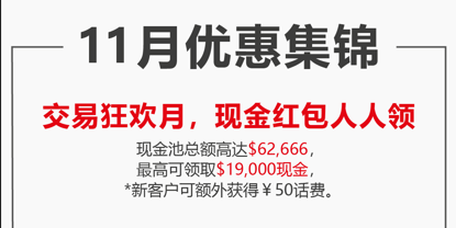 交易狂欢月、现金人人领!现金池总额$62,660现金,最高可获得$19,000现金! X独家直播课程重磅上线,最前沿的行情解析、实用交易技巧,四位行业知名讲师,周一至周五直播教室为您答疑解惑。 双十一来积分商城抽奖,不花钱、100%领好礼! 每日打卡微信游戏:惊喜大满贯!随机抽取积分、赠金
