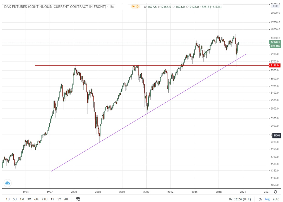 自5月14日以来,全球股指尤其是美国之外的欧洲、日本地区的股指进一步犀利上行。且不论这轮升势是由于复工复产的积极预期,还是疫苗进展令人振幅,或者纯粹是零利率引发的估值无限扩大过程。 德国DAX指数长期升势可能延续 DAX指数2~3月的暴跌在月线自2003年开始的支撑线、2000年及2007年高点不出意外地为价格提供了