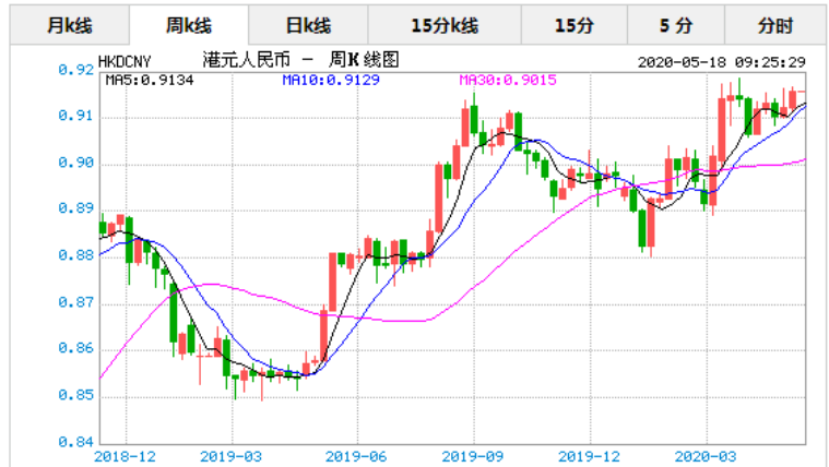 汇率换算 2020年5月16日银行间外汇市场人民币汇率中间价为:1港元=0.9162人民币,1人民币≈1.0915港元。 1港元=0.9162人民币 1人民币≈1.0915港元 港币兑人民币一周走势图: 数据仅供参考,交易时以银行柜台成交价为准。