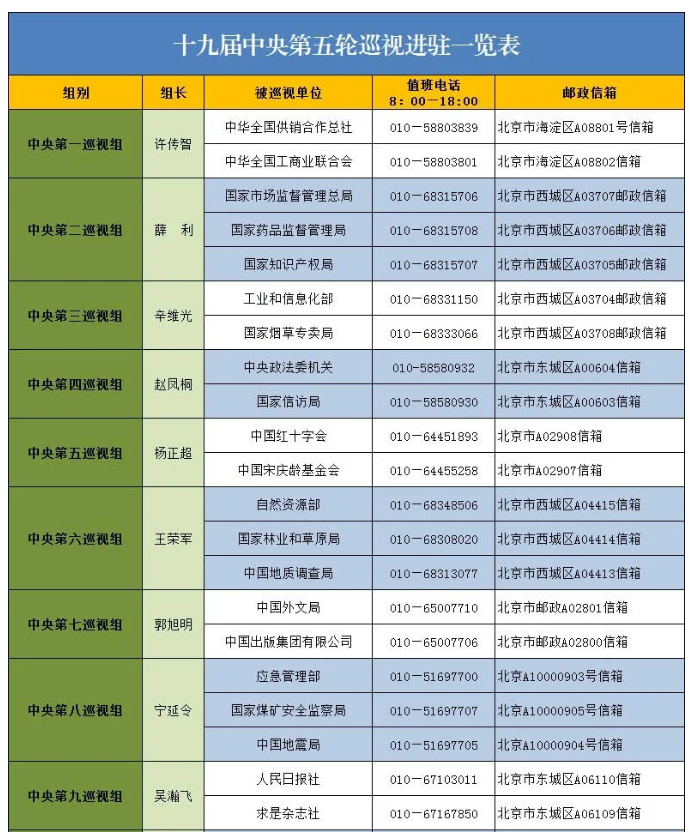 截至5月16日,十九届中央第五轮巡视15个巡视组完成对中央宣传部(中央文明办)、中央政法委机关、中央网信办等35个中央和国家机关单位党组织的进驻。据了解,中央巡视组将在各被巡视单位工作2个月左右。巡视期间设专门值班电话和专门邮政信箱,主要受理反映被巡视单位党组织领导班子及其成员、下一级党组织领导班子主要