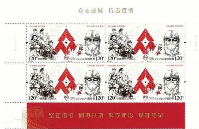 5月11日,中国邮政特别发行1套《众志成城抗击疫情》邮票,军人、医护、科研人员、社区工作者、警察、志愿者的形象,被以“众”字相连,邮票发行收入将捐赠用于抗击疫情。该邮票全套两枚,面值各1.20元,分别为:众志成城、抗击疫情,采用连票的形式,以一个“众”字将两枚邮票紧密连接,寓意着面对重大公共卫生事件,