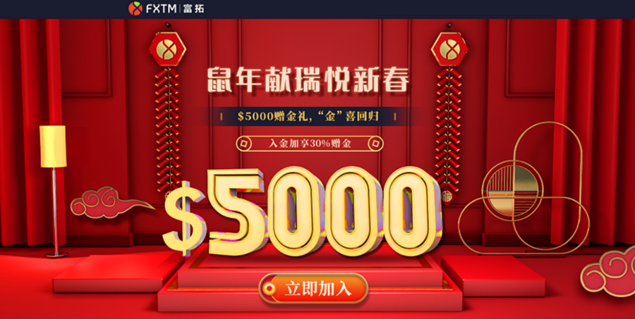 鼠年献瑞悦新春,FXT富拓$5000赠金礼,“金”喜回归!在30天活动期内,您的每次入金即可获得额外30%赠金,最高可达$5,000!我们用满满的诚意,为您的开年交易加油助力! 【活动对象】FXT富拓的新客户、首次入金或暂无交易活动的休眠客户*或代理商介绍的客户或网络联盟商介绍的客户。 *在连续30