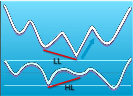 常规背离被交易者用来作为趋势反转的信号使用。 如果价格低点不断走低(LL),但是震荡指标低点却不断走高(HL),那么,这就是我们常见的常规多头背离。 常规多头背离通常发生在下降趋势的末期。在第二个底部形成后,如果震荡指标未能形成新的低点,那么汇价很可能上涨,而且通常预计汇价和动能随之将保持一