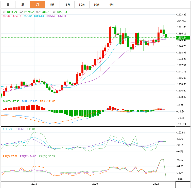 截止5月31日黄金市场,金价从月初的开盘价1894.79,月底收盘价1850.17,黄金整个5月仍然处于1840-1870的区间震荡当中,其中5月16日,金价触及月低1786.51。美联储在5月政策会议上将基准利率上调50个基点至0.75%-1.00%区间,以遏制40年来最高的通胀,这是美联储自2000年以来的最大幅度加息。近几周,由于投资者担心美联储