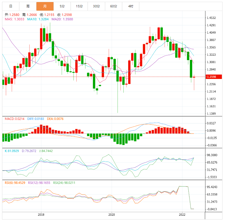 5月英镑兑美元行情,英镑兑美元从5月初的开盘价1.2852,当月收盘价1.2597,5月下跌255点,5月13日触及最低点1.2155。5月英国央行公布加息25个基点,将基准利率从0.75%上调至1.0%,达到2009年以来最高水平。这是英国央行自去年12月以来第四次加息。当月,央行将基准利率从0.1%的历史低位上调至0.25%,今年2月和3月又分别