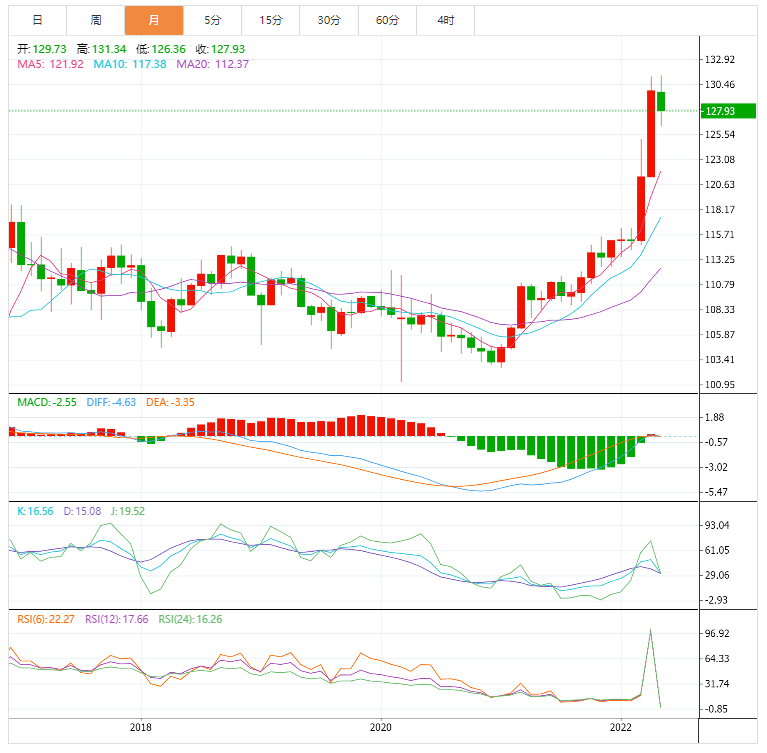 4月英镑兑美元行情,英镑兑美元从4月初的开盘价121.69,截至收盘价129.86。日元4月整体上涨817点,日元在4月28日上涨至月内高点131,25。 4月美元兑日元汇率走势分析 第一周美元/日元行情 第一周,日元大跌逾1%。除了美元走强带来的利空,日本央行似乎乐意看到弱势日元,对日元近期下跌会推高进口成本,进
