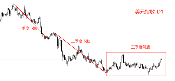 ATFX汇评:美元指数四连阳,有望突破100关口 ATFX汇评:今年三季度,美元指数一直处于横盘筑底状态。7月1日,美元指数跌至阶段性低点96.34点,完成了今年以来的主体下跌波段。7月1日之后,美元指数宽度横盘震荡,上限100.23点(出现在8月1日),下限96.18点(出现在9月17日)。截至目前,上下限均未被突破。 ▲ATFX图