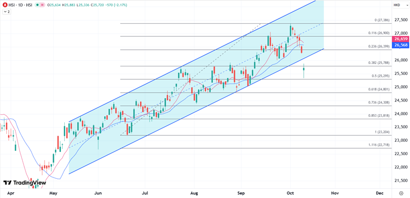 ATFX港股:关税威胁引发港股大跌,恒指五日连跌后继续寻底 ATFX港股:特朗普突然宣布新关税,原本已连跌5日的港股进一步寻底,今早进一步跌穿两万六关口,一度下跌多达954点,低见25336点,半日收报25374,挫916点或3.49%;国指跌325点或3.48%,报9032点;科指跌284点或4.54%,报5975点。大市午后初段跌幅略收窄至近8