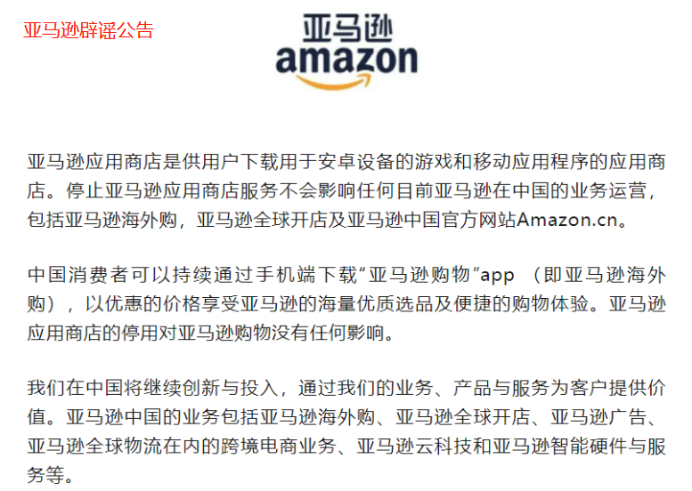 ATFX美股:亚马逊不再提供应用商店服务,为何被解读为推出中国市场? ATFX美股:5月23日,亚马逊发布客户邮件称:自7月17日起,亚马逊中国将不再提供应用商店服务。注意,不再提供服务的是“应用商店”,而非“亚马逊官网”。这封邮件导致了巨大的误解,网络上疯传“亚马逊关停官网”“亚马逊退出中国”等不实消息。5月