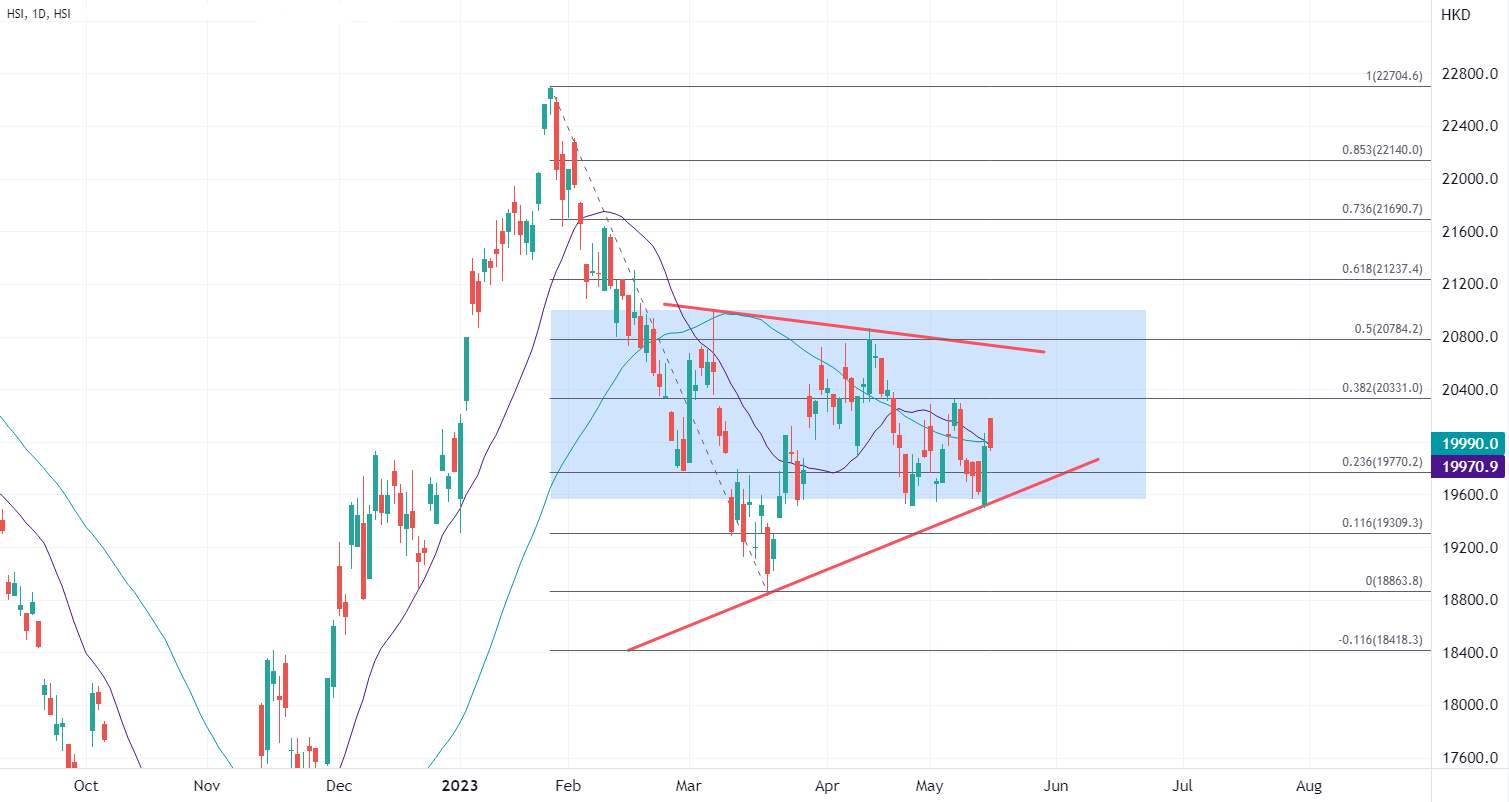 ATFX港股:恒指昨日大涨后回吐,科技股业绩有望提供支持 ATFX港股:港股昨日升逾300点后,今早高开逾两百点后升幅收窄。内地公布中国4月份工业增加值、零售及固定资产投资数据逊预期,公布后恒指一度回吐部分涨幅。受隔夜美股中概股大涨带动,港股回港中概股全线走强,科技指数早段曾升逾1%,午后收窄至0.6%。 昨日跑