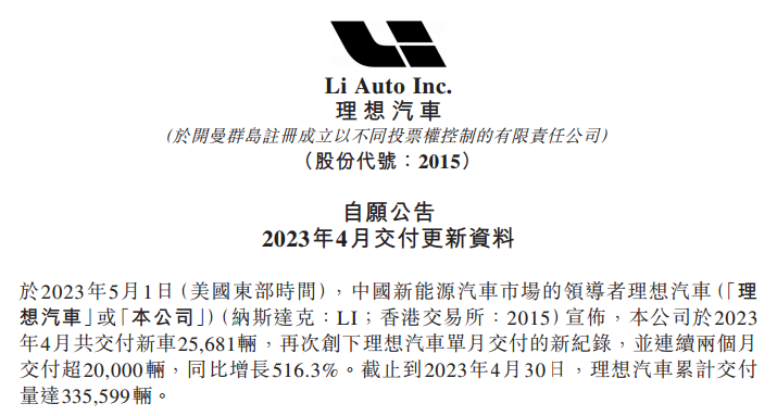 ATFX港股:理想汽车四月交付25681辆新能源车,创下单月交付新纪录 ATFX港股:5月1日,理想汽车发布四月份交付量数据:共交付新车25,681辆,再次创下理想汽车单月交付的新纪录,并连续两个月交付超20,000辆,同比增长516.3%。截止到2023年4月30日,理想汽车累计交付量达335,599辆。不出意外,理想汽车再次成为造车新势