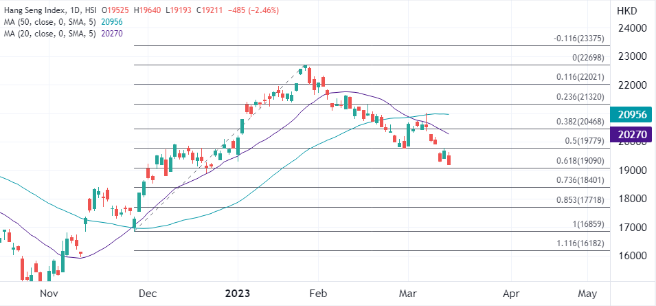 ATFX港股:港股乏力但成交保持活跃,继续留意震荡模式 ATFX港股:昨日弹升376点后,今日恒指低开171点,盘中一度转涨但未能延续,倒跌再创今年的新低,午后跌幅超过2%,除了公用分类指数外全线走低,金融分类指数以逾3%的跌幅领跌。 银行股继续受压,汇控(00005)拟向矽谷银行英公司注资20亿镑,股价今早低开3.6%后