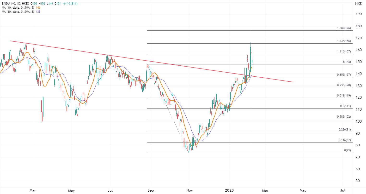 ATFX港股:百度大涨20%撑市,恒指连跌三日后整固 ATFX港股:连跌三日之后,今日恒指轻微高开后最多曾升近300点,午后初段涨幅为0.45%,蓝筹股整体走高,除了公用分类指数外的分类指数几乎全线走高,其中以科指领涨。 恒生科技指数午后升幅在1%左右,百度(09888)在科网股中领先,腾讯(00700)和阿里巴巴(09988)早段盘