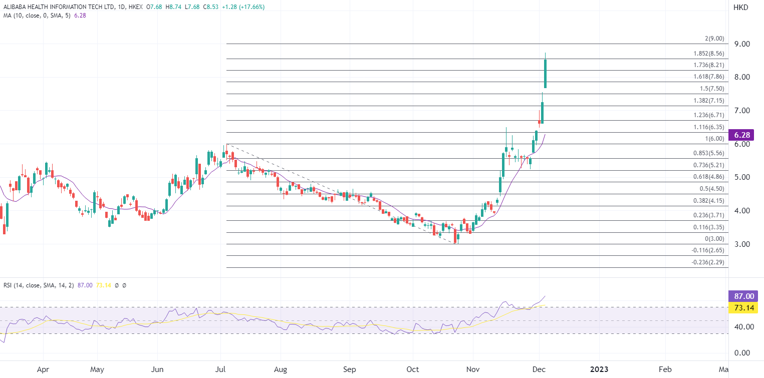 ATFX港股:关键性政策陆续落地,互联网医疗股强势爆发 ATFX港股:中国多地逐步放宽防疫措施,周一港股互联网医疗股日内集体走强,阿里健康(0241.HK)破顶升逾16%,为盘中表现最佳的蓝筹,京东健康(6618.HK)升近12%,平安好医生(1833.HK)一度升逾20%。 随着全国多地近期相继宣布优化疫情防控,即日起药店将不再登记