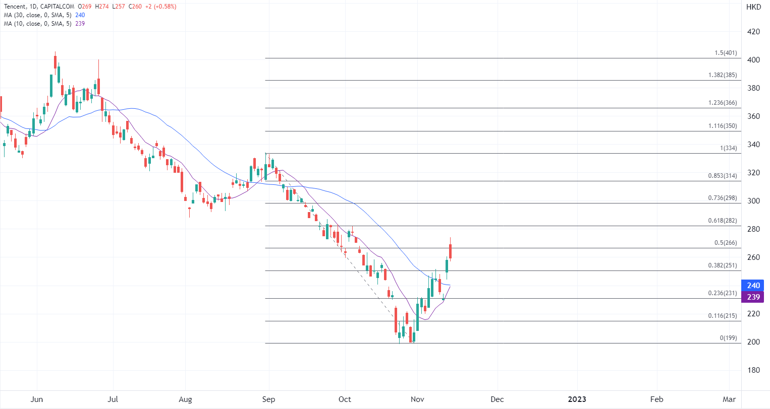ATFX港股:Q3盈利跌势有望收窄,腾讯绩前股价谨慎走高 ATFX港股:腾讯控股(0700.HK)将于11月16日(本周三)公布业绩,绩前股价延续自上周以来的造好表现,今早录得逾一个月高位后回吐,市场预期腾讯季内经调整盈利继续下滑,但跌幅料较上一季度的17%收窄。 整体来看,由于期内缺乏重榜游戏版号,加上宏观不确定性