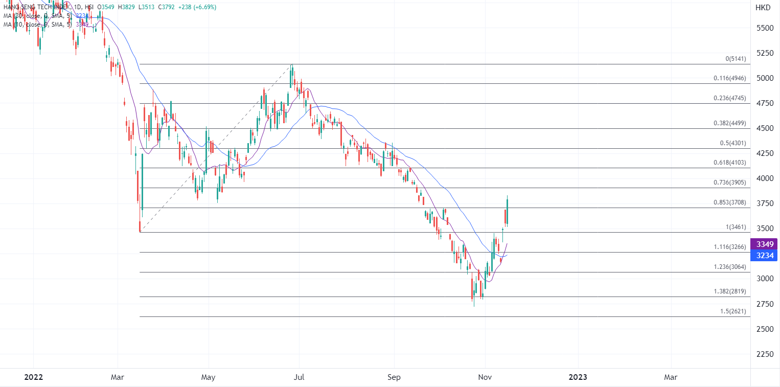 ATFX港股:恒指重返一万八关口,聚焦重磅科网股业绩 ATFX港股:尽管内地10月「三辆马车」零售、工业、固定投资数据均逊于预期,无阻港股今日延续前两日的走高,恒指半日升逾600点,重上18000点关口,科技指数半日大涨6.8%,午后升势持续,维持在3750点上方。 ▲ATFX供图 科网股走势集体向好,哔哩哔哩(9626.H