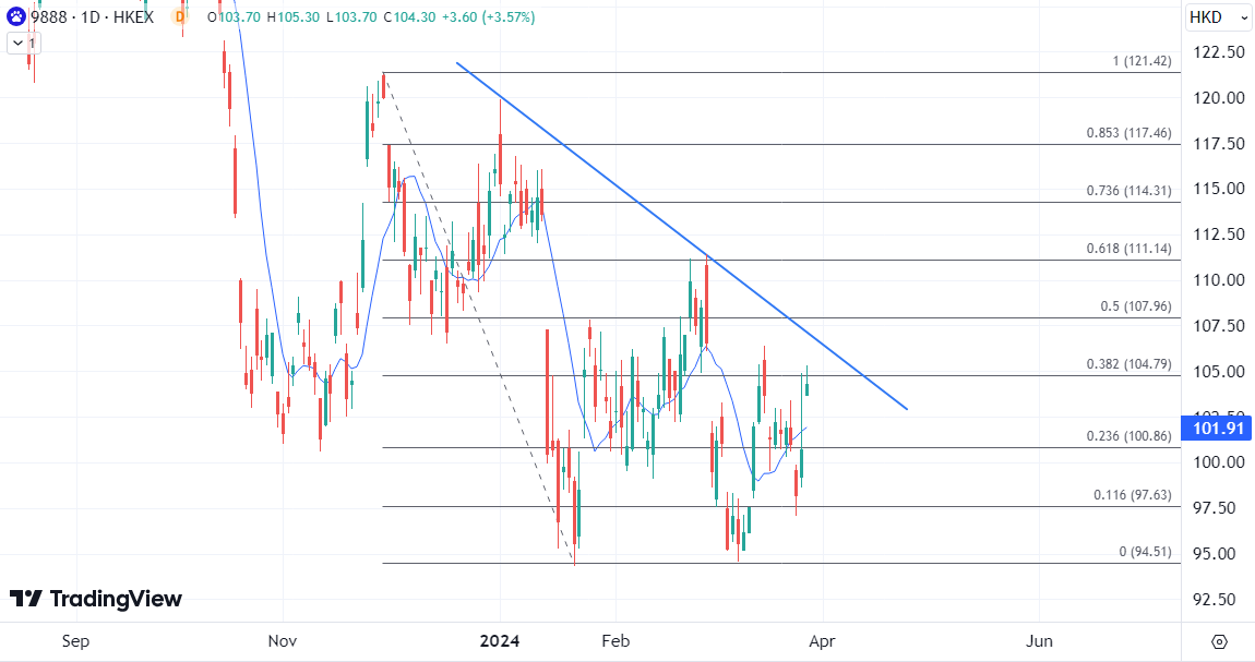 ATFX港股:传为苹果提供AI功能,百度股价连续两日拉升 ATFX港股:传周一百度港股股价(09888)一度涨超6%,有消息称苹果将在中国产品中采用百度AI服务。尽管百度和苹果官方仍没有回应,但百度美国存托股上周五曾因此消息一度上升4%,成交大增1.4倍。 苹果一直在探索利用外部合作伙伴,来协助加速人工智能雄心。据上周