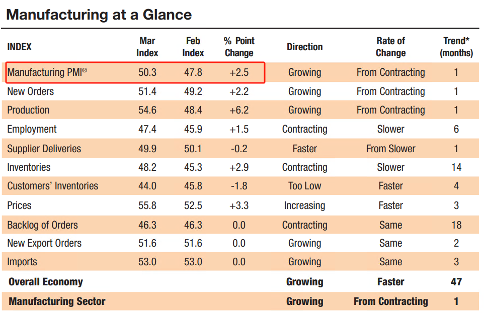 ATFX汇市:美国3月I制造业I为50.3,远高于前值47.8,经济景气度高 ATFX汇市:虽然国际市场的主流预期是美联储将于今年六月份开启首次降息,但降息的前提条件——美国经济显著衰退——似乎远未到来。此前公布的美国非农就业报告显示,新增非农就业人口27.5万人,处于近12个月的数据峰值水平;失业率3.9%,低于自然