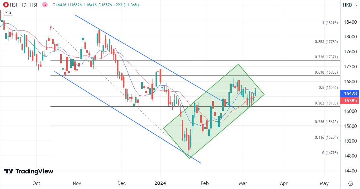 ATFX港股:在科网股刺激下重新振作,恒指重新瞄准17000关口 ATFX:今日港股在科网股的拉动下重新振作,恒指半日升209点,报16562点,成交520亿港元;科技指数半日升2.55%,在主要指数中领跑;国企指数录得1.44%的上涨。 科技指数午后升幅2.58%,哔哩哔哩(09626)盘中飙高13.7%;京东集团(09618)、美团(03690)升5.7%;快