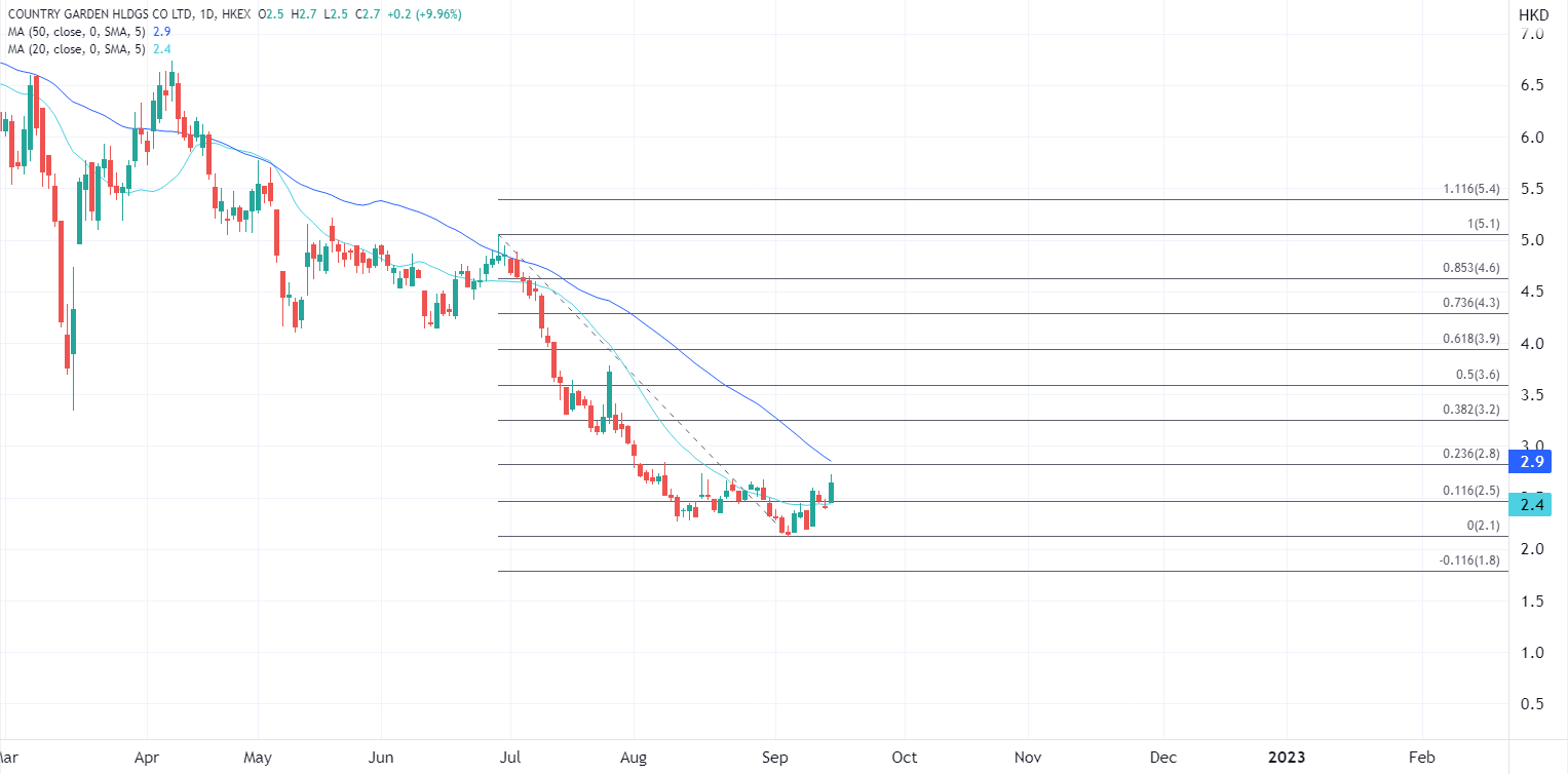 ATFX港股:住建部强调市场平稳发展,内房股日内急涨 ATFX港股:昨日普遍走低的内房股今早大幅反弹,碧桂园(2007.HK)升11.6%,为盘中表现最好蓝筹;碧桂园服务(6098.HK)上涨逾一成;龙湖(0960.HK)升8.5%;中海外(0688.HK)升5.6%;润地(1109.HK)升4.1%;旭辉(0884.HK)一度炒高13%。 最新消息来自于9月14日,住建部表
