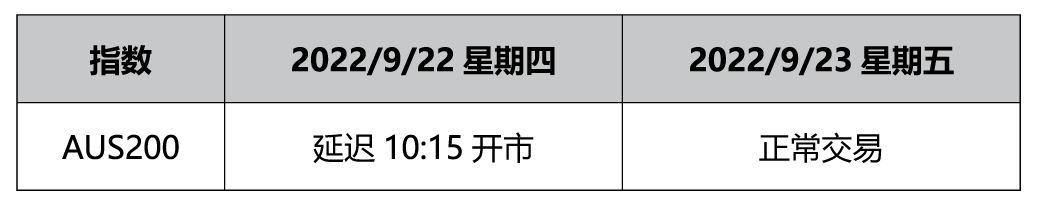ATFX于澳洲假期及夏令时间的交易安排更新 尊敬的客戶: 您好! 由于澳洲将于2022年9月22日(星期四)定为澳洲全国哀悼日假期,而2022年9月22日(星期四)开始相关产品的交易时间将受到影响。 以下商品在澳洲全国哀悼日假期的交易时间将有所调整,详情请参看以下列表。 注:以上是GT+3交易平台时间,