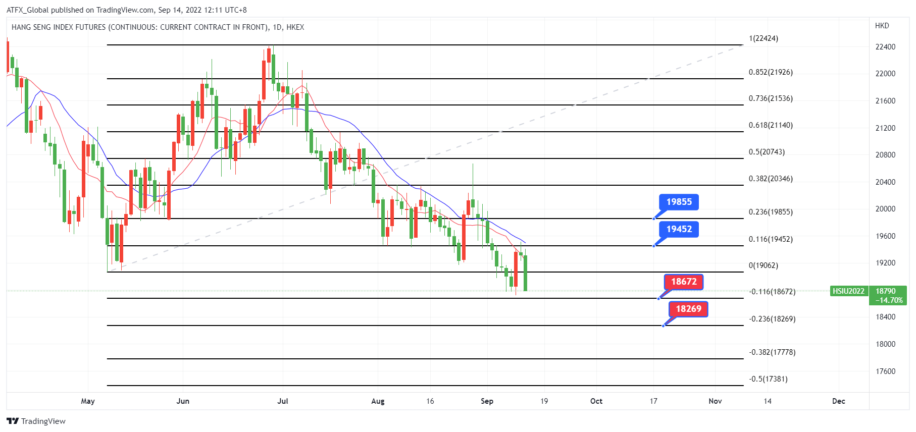 ATFX恒指追踪美通胀高企支持美联储的加息,空头仍主导恒指走势 ATFX恒指:周二数美国重磅数据显示,美国8月CI同比上涨8.3%,高于市场预期的8.1%,尤其是8月核心CI同比上涨6.3%,也高于市场预期的6.1%,这表明CI仍然呈现居高不下的态势,巩固美联储美联储9月21日议息决意加息幅度至75个基点。美国8月CI数据结果令市