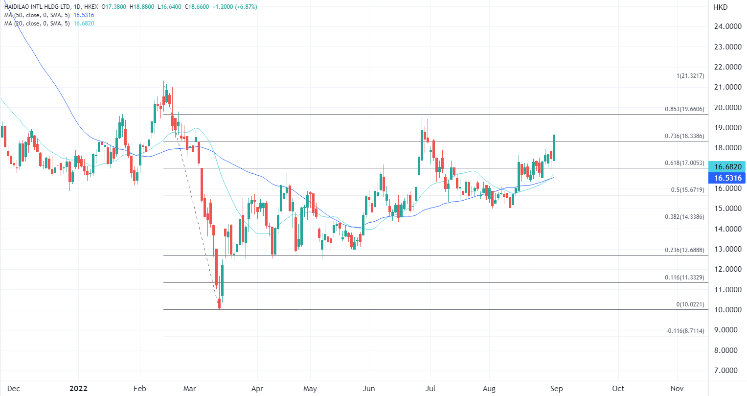 ATFX港股:上半年业绩按年倒退,海底捞股价反而强劲抽升? ATFX港股:8月30日,海底捞(6862.HK)发布2022年中期业绩公告,公司上半年营业收入总额167.64亿元,同比下滑16.6%,净亏损2.67亿元,去年同期盈利0.97亿元,宣布不派中期息。 收入构成中,占绝大部分的海底捞餐厅经营收入为158.6亿元,大减18.3%;期内整体同店