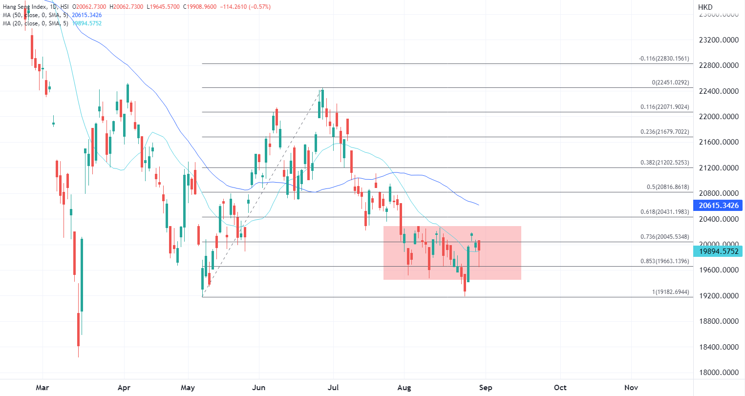 ATFX港股:期指结算日恒指向下,两万点攻防决定月线是否连跌 ATFX港股:今日港股期指结算日,恒指未能延续周一的反弹,早段跌幅维持在300点左右,午后跌逾0.5%,分类指数全线向下,科技指数跌逾1%,金融分类指数跌逾0.6%。 大型科技股普遍走低,其中阿里巴巴(9988.HK)、腾讯(0700.HK)、美团(3690.HK)、小米(1810.H