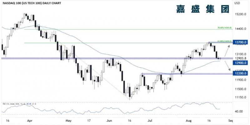 交易者静静享受着夏季的结束,不愿在鲍威尔周五主题演讲发布之前持仓过重。我们趁此机会观察我们广泛交易的股指,即纳斯达克100指数(美国科技100指数)的一些关键价位。 美联储主席鲍威尔本周五将在杰克逊霍尔经济大会上发表主题演讲。 如下图所示,纳斯达克100指数上周创下的最高点相较6