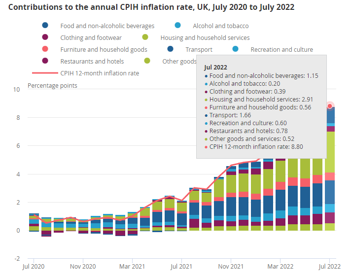 ATFX:英国7月CI增速10.1%,GUD持续阴跌 英国有两项消费者物价指数,分别为CI和CIH,前者是投资分析通用指标,后者因为包含自有住房的成本(亦即OOH,约占CIH的17%),所以被英国统计局看重。7月份英国CIH增速8.8%,高于前值8.2%,对物价上涨贡献最大的是住房和家庭服务(主要来自电力、天然气),其次是交通费