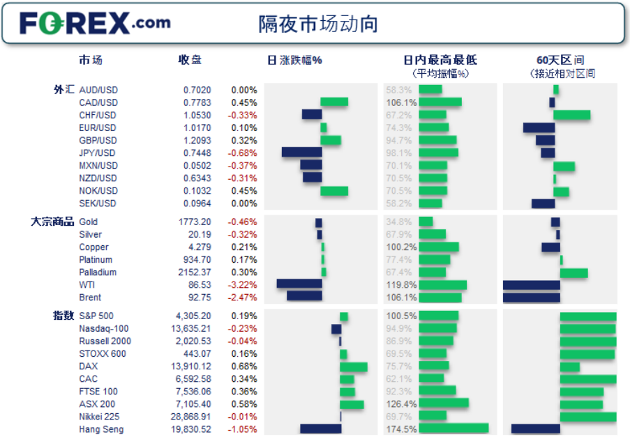 隔夜市场波动/上周的前期波动 美股因积极财报而上涨,又因疲弱经济数据而回吐早盘涨幅。 美国营建许可降至9个月低点,房地产行业继续遭到上升利率的打压。 美元指数本来似乎有望连续第三天上涨,但最终将昨天涨幅回吐殆尽,以一根看跌iar收平。 加拿大核心CI年率8个月