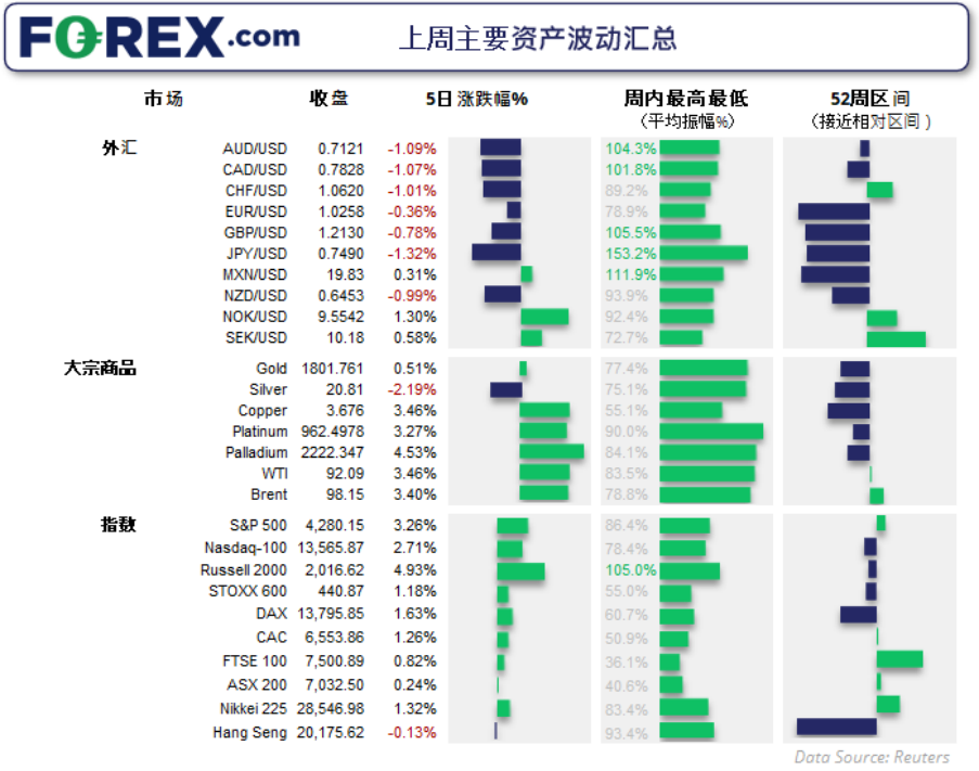 上周的前期波动 上周主要货币中,最强和最弱分别是澳新货币和美元。 美元承压下挫,原因是美国通胀率11个月中首次弱于预期,削弱有关美联储像原来那样积极加息的担心情绪。 黄金因此得到助力连续第四周反弹,而且周线实现6周中首次收上1800。 油价上周五走弱,美国修复墨西哥湾一条受损的石油管道。 美股