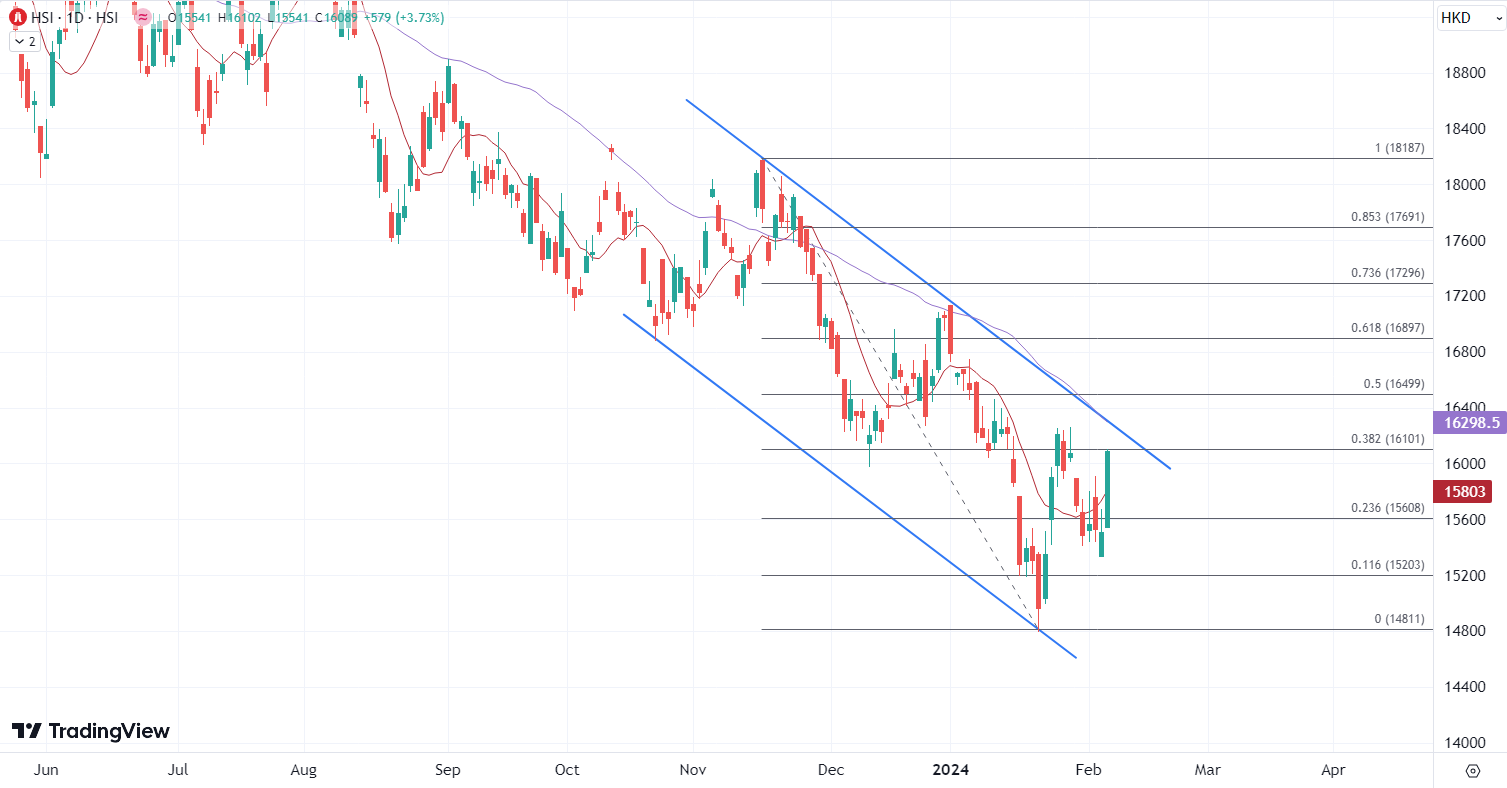 ATFX港股:中央政策再度出招,恒指重夺万六关口 ATFX港股:据报中国多方面限制国内及境外机构投资者交易遏止股市大跌,加上更多政策面出招,港股今早高开,在科网股支撑下造好,恒指升幅扩大至逾200点,午后涨幅扩大至逾500点冲上16000点关口。 恒指半日升380点或2.5%,报15,890点;国指升161点或3.1%,报5,378点;